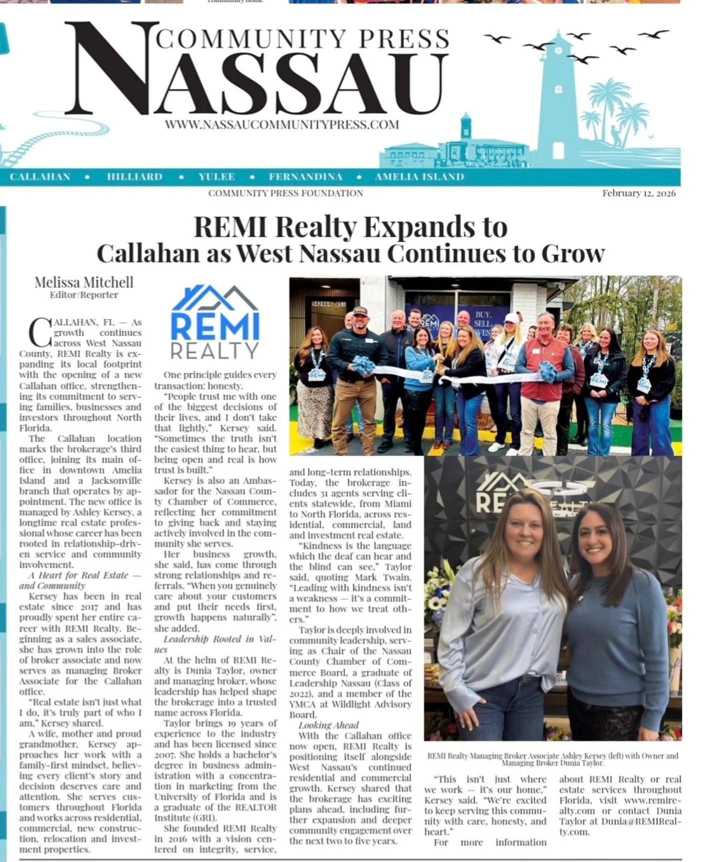 As recently featured in Nassau Community Press, REMI Realty has officially opened a new branch office in Callahan, Florida, marking an exciting new chapter for our brokerage and the communities we serve. This expansion reflects not only the continued residential and commercial momentum in West Nassau, but also our long-term commitment to being present, accessible, and deeply invested in the places our customers call home.